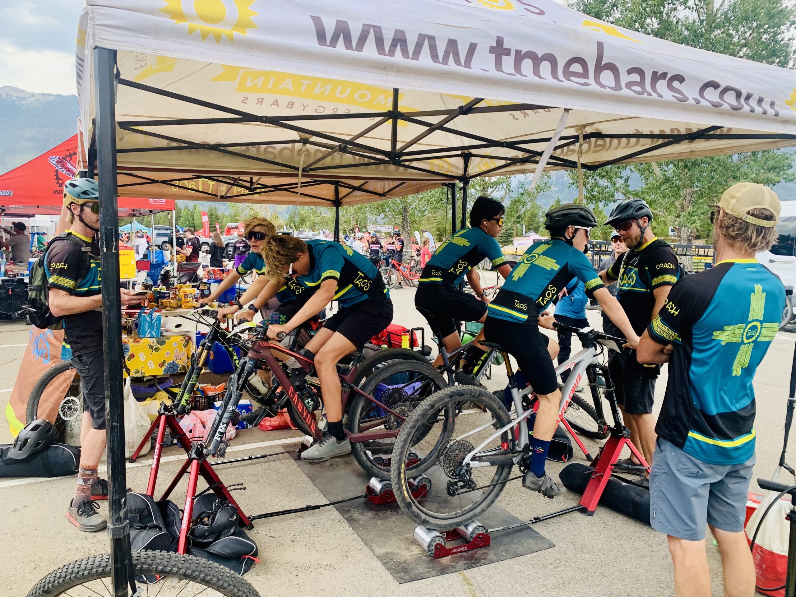 Race day (Sunday) began bright and early with perfect temperatures and weather for racing. The team is trying something new for warm ups this year, thanks to sponsor donations to purchase stationary trainers. With race venues not always having the best and safest spaces available for warm up, the trainers give coaches and athletes the opportunity to get warmed up properly.